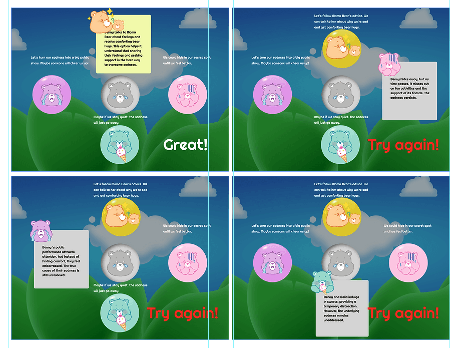 Before conducting my design into high fidelity design, I take my wireframe to 5 users (average 4 years old) doing the simulation test, including text, size, storytelling, structure,visual iteration. The satisfaction of 2nd usability testing raises 36% .