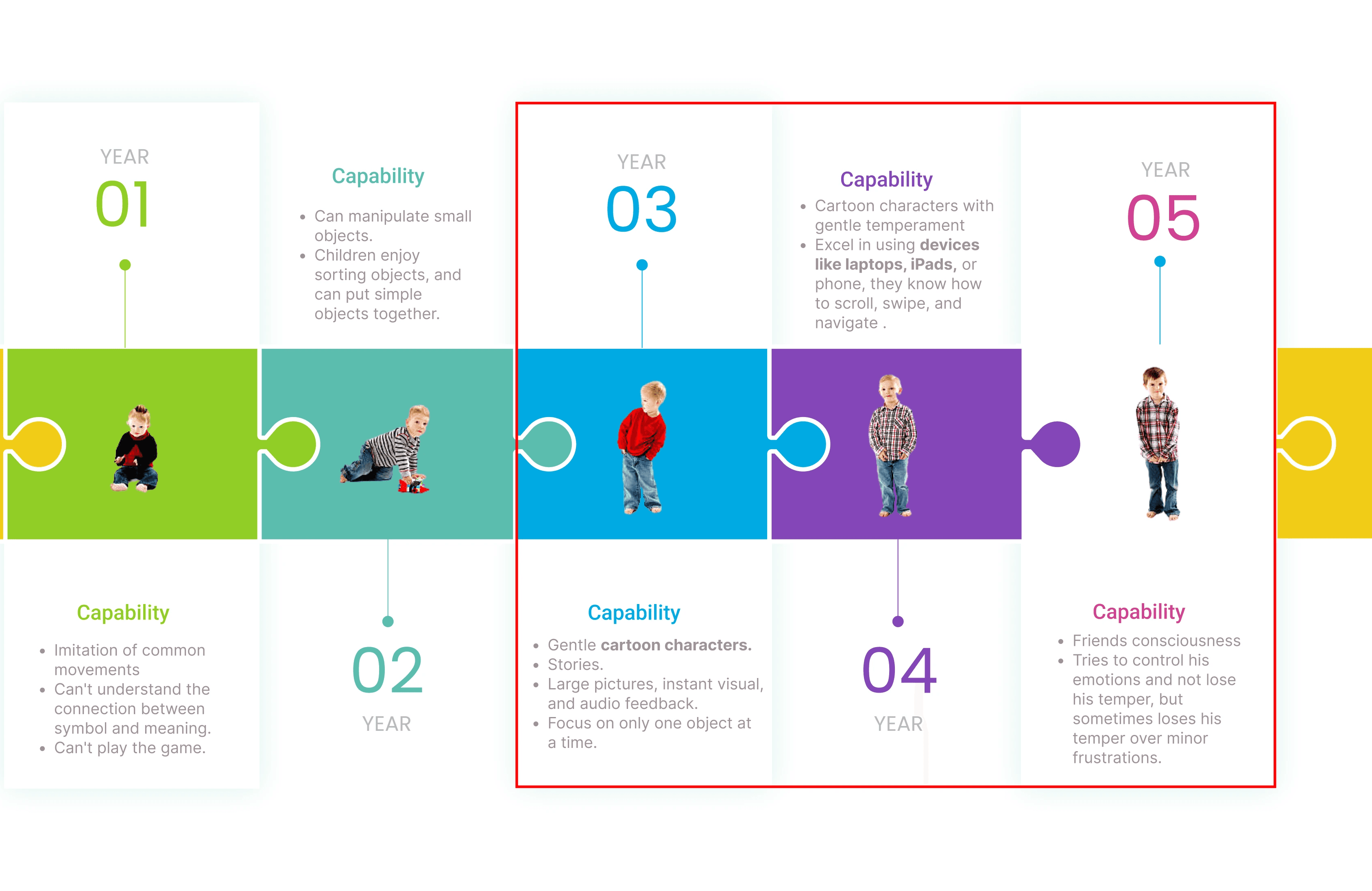 To find the ideal age for starting emotional education, I researched kids' preferences and capabilities. The result: Ages 3 to 5 emerged as the perfect time to begin teaching emotion management.