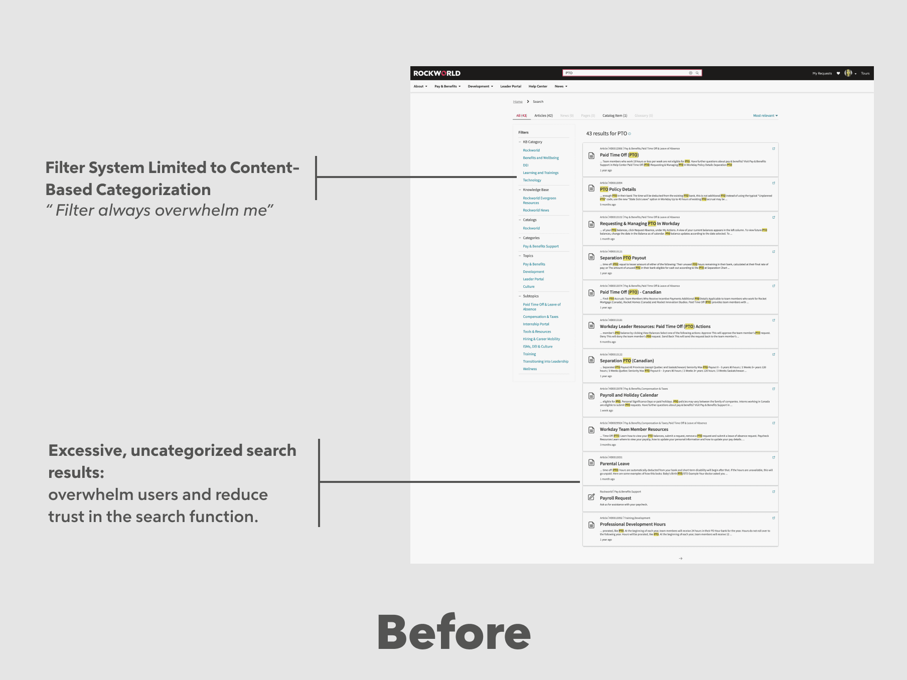 Alex searches “PTO request” and encounters a long list of uncategorized results filled with scattered, repetitive information, making it difficult to find the right answer.
