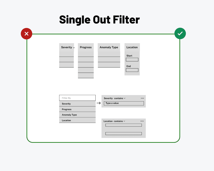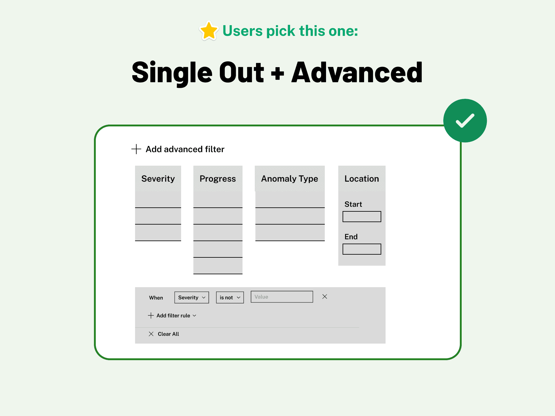 Selected through quick user testing, this approach balances simplicity for fast filtering and flexibility for complex queries, ensuring efficiency across different user needs.