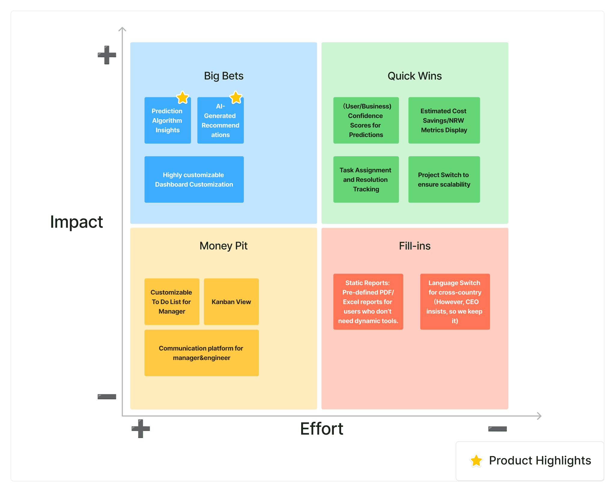 When defining specific features, multiple possibilities emerged. To address this, I conducted workshops and used MoSCoW & Impact-Effort metrics for feature prioritization. Nice-to-have features were scoped as scalable for future iterations.